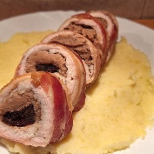 Aszalt szilvával gesztenyével töltött csirkemell baconbe tekerve