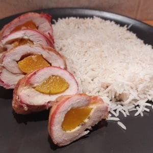 baconbe tekert barackos csirkemell sütőben rizzsel