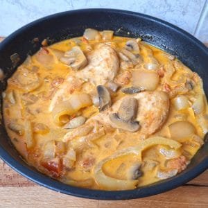 9. Tedd az elősütött csirkemell szeleteket a levével együtt a szaftba, és fedő alatt párold puhára.