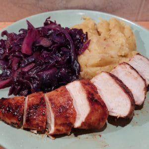 Ennek a receptnek az ötletét a csemege karaj adta, amit gyakran kínálnak párolt káposztával és hagymás tört krumplival. Csirkemellből készítve is nagyon finom, és még gyorsabban is elkészül.
