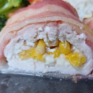 Füstölt sajttal kukoricával töltött csirkemell baconbe tekerve egy finom töltött csirkemell recept, ahol az édes kukorica és az olvadó füstölt sajt szuper ízharmóniát ad.