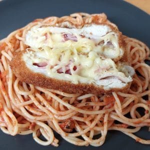 17. Most jön a polpetti csirkemell tálalása. Tegyél a tányérra egy adag bolognai spagettit. Hosszában vágd félbe a sonkával sajttal töltött csirkemellet, és helyezd a tészta tetejére. Szórd meg reszelt sajttal.