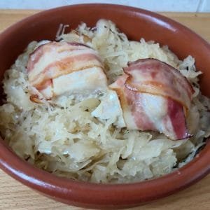 10. Helyezd a baconbe tekert csirkemell darabokat a savanyúkáposzta ágyra.