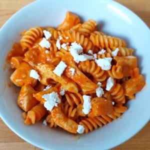 Különleges csirkés tészta recept sült paprikás fetás szósszal.