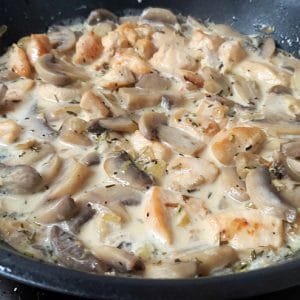 9. Öntsd fel a tejszínnel, és tedd vissza a csirkemell kockákat a gombás raguba.